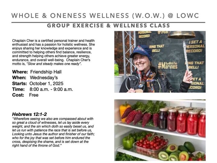 Chaplain Cher is a certified personal trainer and health enthusiast and has a passion for holistic wellness. She enjoys sharing her knowledge and experience and is committed to helping others find balance, resilience, and strength helping others achieve greater energy, endurance, and overall well-being. Chaplain Cher’s motto is, "Slow and steady makes one ready”.